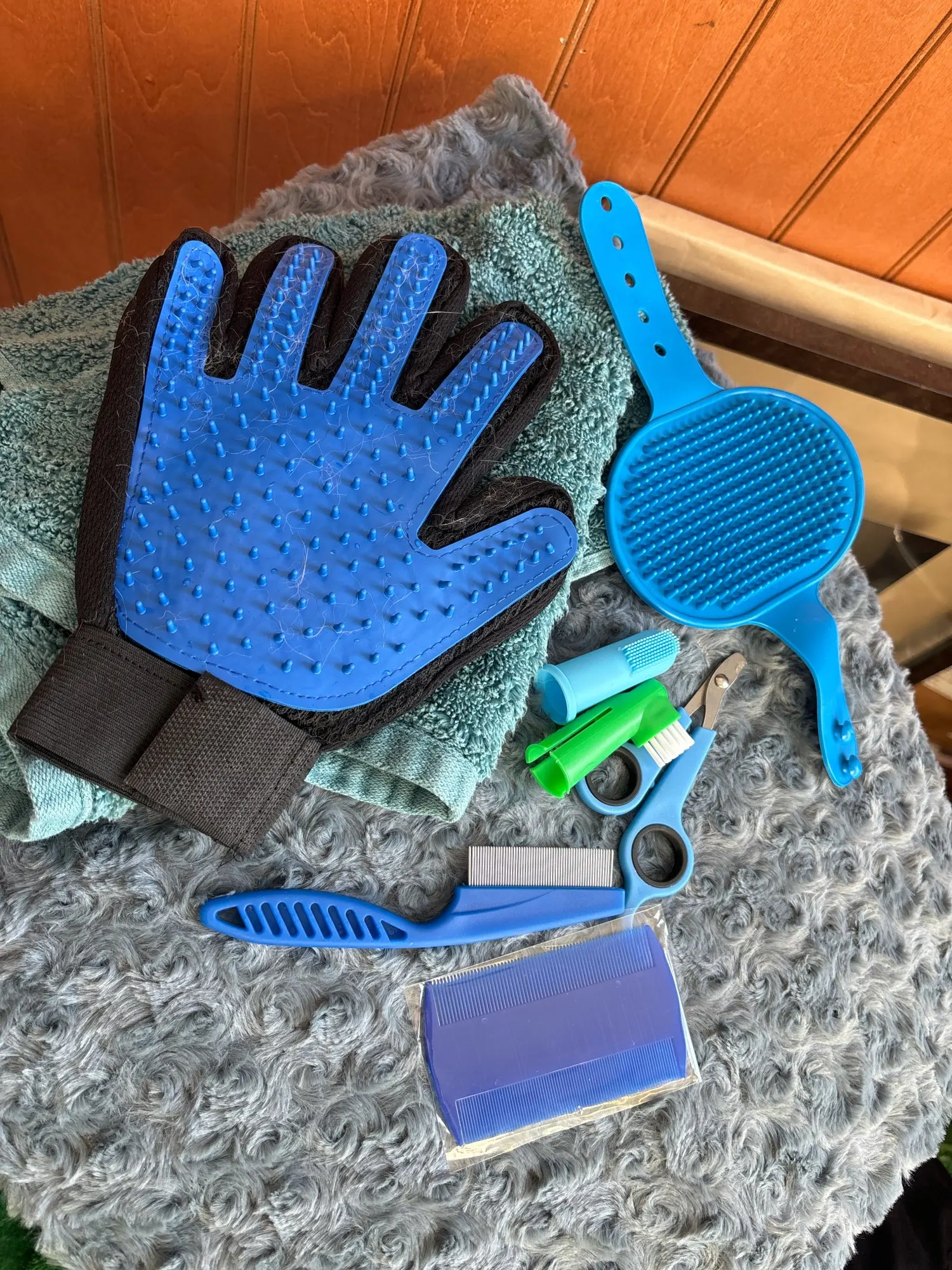 A lot of stuff! I'm not sure how to clean the glove from cat hair and i thought the blue brush will stick to the wall instead of a belt.