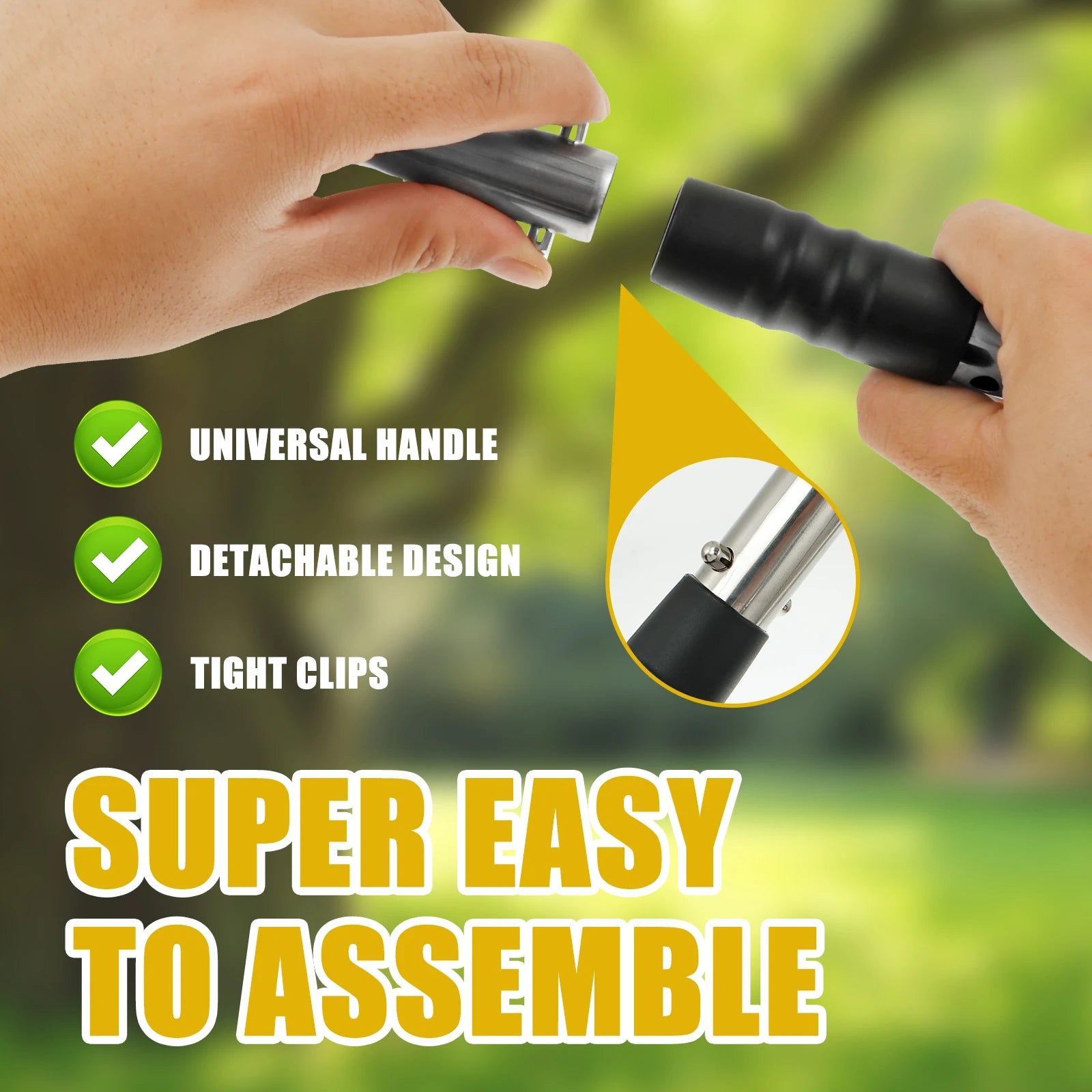 This pooper scooper is treated with non-stick coating, very effortless to clean, just rinse it with a hose after use, the handle and spade head are detachable design, easy to assemble and disassemble, space-saving.