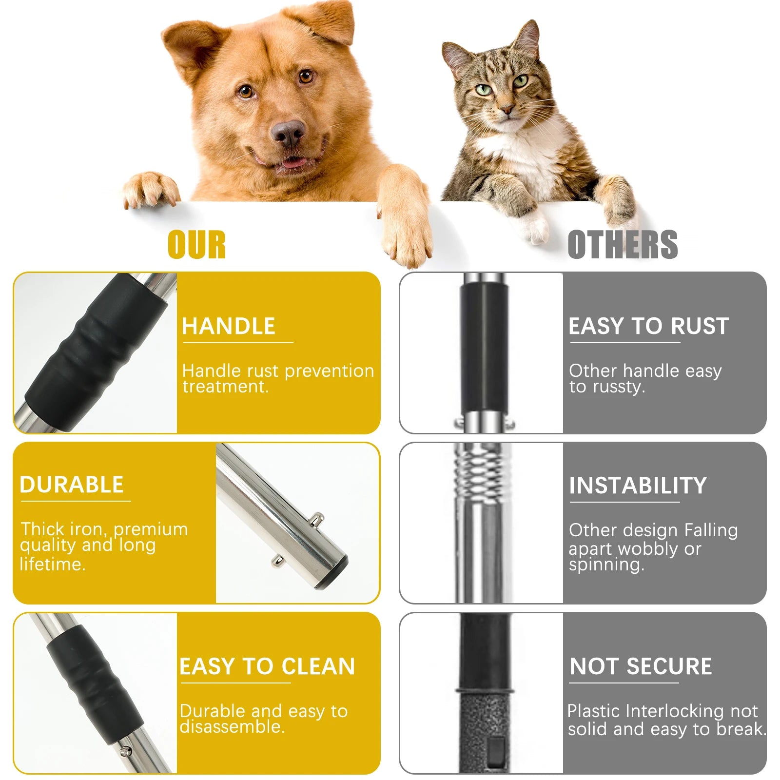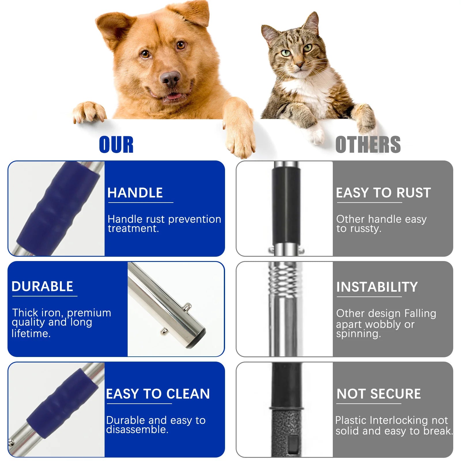 This dog pooper scooper is made of high-quality metal and plastic materials, the rake, spade tool, and dustpan tray are treated with anti-rust treatment, even when exposed to wet or outdoor conditions, they won't rust, dirt-proof, sturdy, and long-lasting.