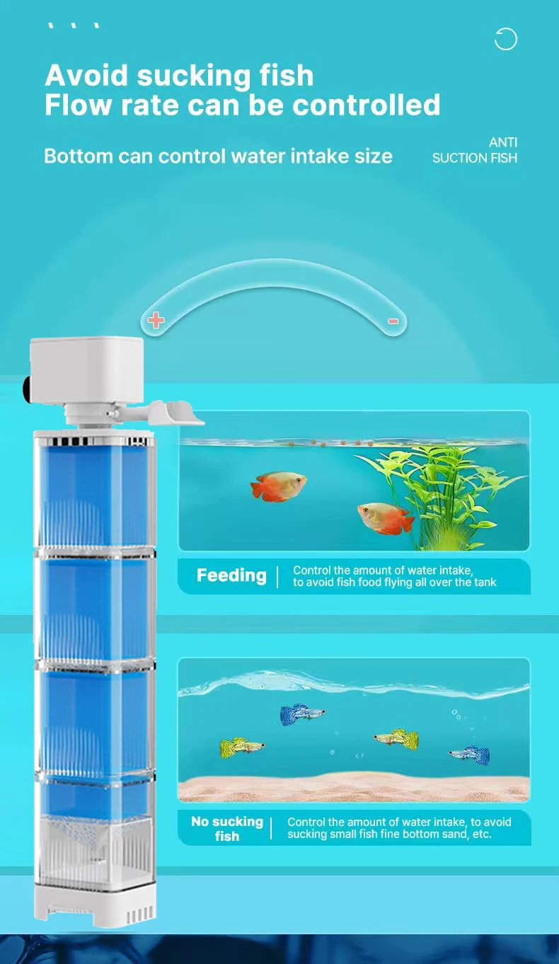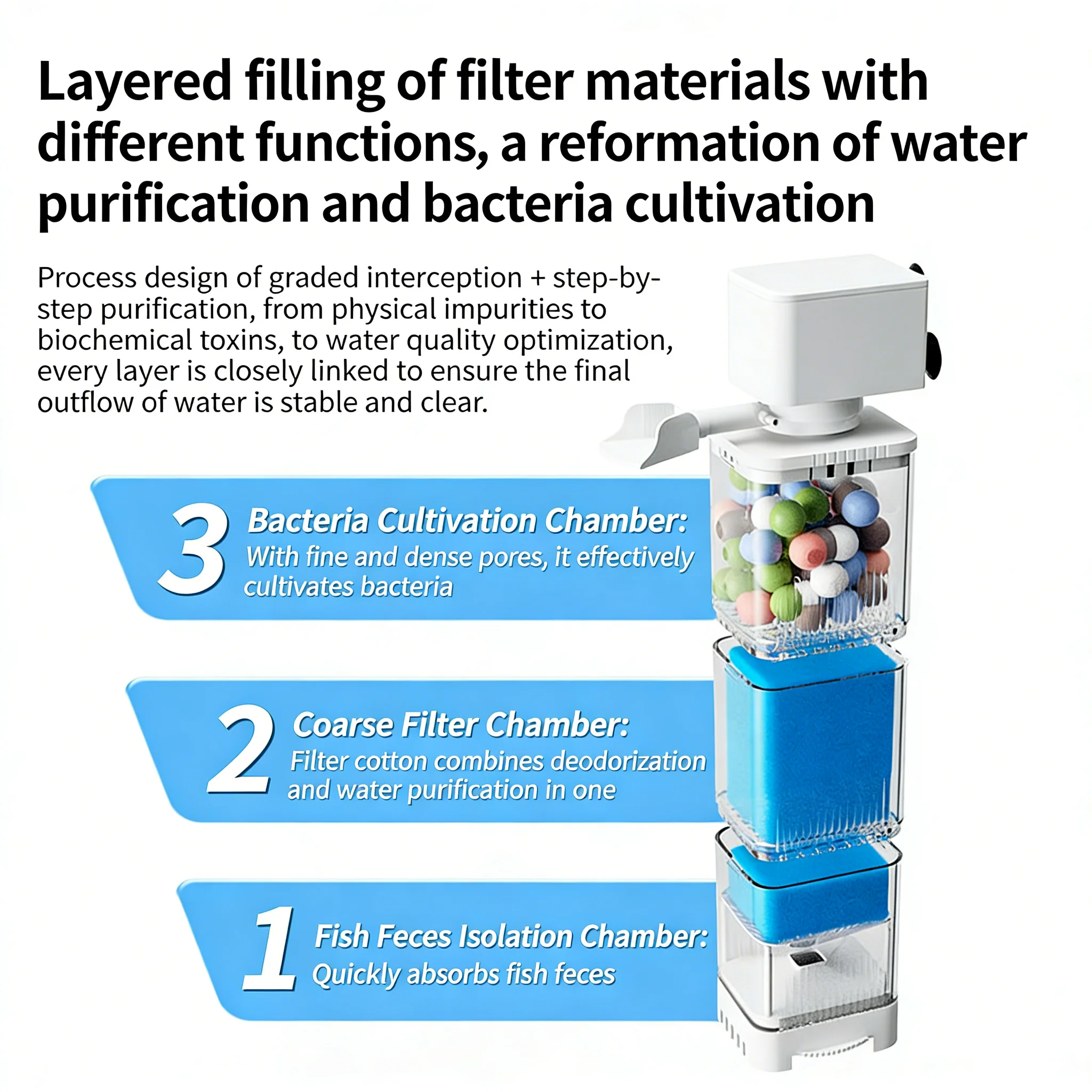 🔹Quadruple Filtration System: Four-stage filtration chambers feature gradient-density sponge design. Air pump-driven upward water flow causes impurities to settle layer by layer within the high-density sponge, effectively purifying cloudy water and eliminating odors. Suitable for fish tanks and turtle tanks.