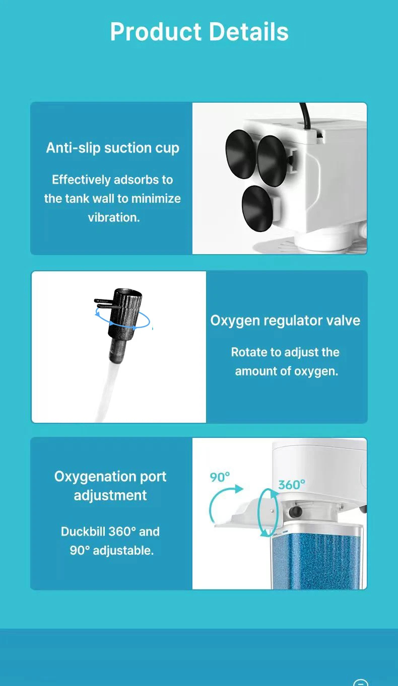 🔹One machine, multiple uses: Experience the dual functionality of our silent aquarium filter! Switch between powerful water filtration and circulation mode to create a crystal-clear aquarium; or connect an air tube to activate dynamic aeration filtration, forming mesmerizing bubble streams. A stylish device that seamlessly integrates water purification, surface agitation, and oxygen enrichment.