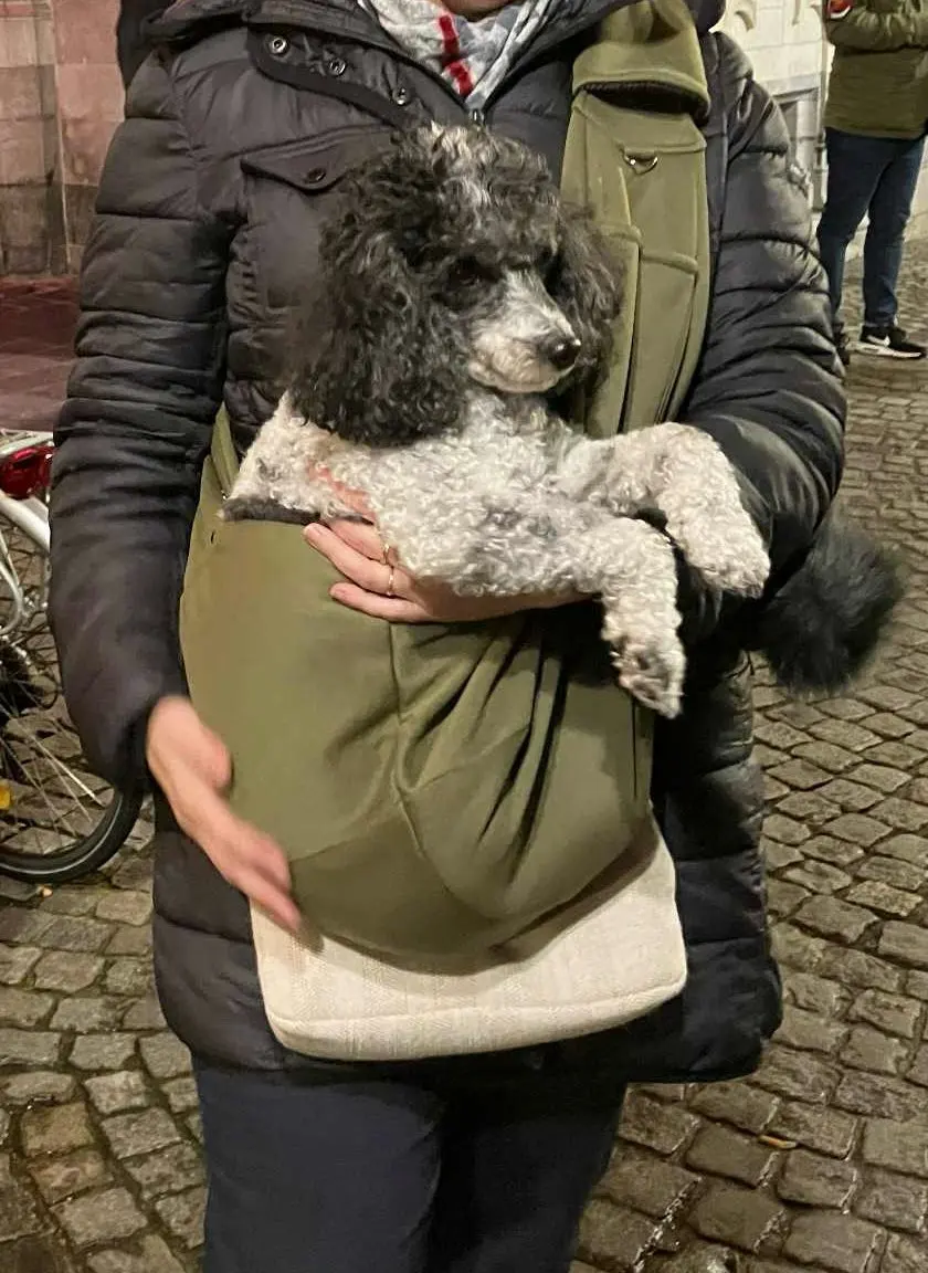 The carrier works perfectly for my 7.5kg dog. She sits down and hangs against my body. She doesn't fit completely inside, but for me, the most important thing is that I don't have to carry her on my arms all the time, and for that, the carrier is ideal. It is also of good quality.