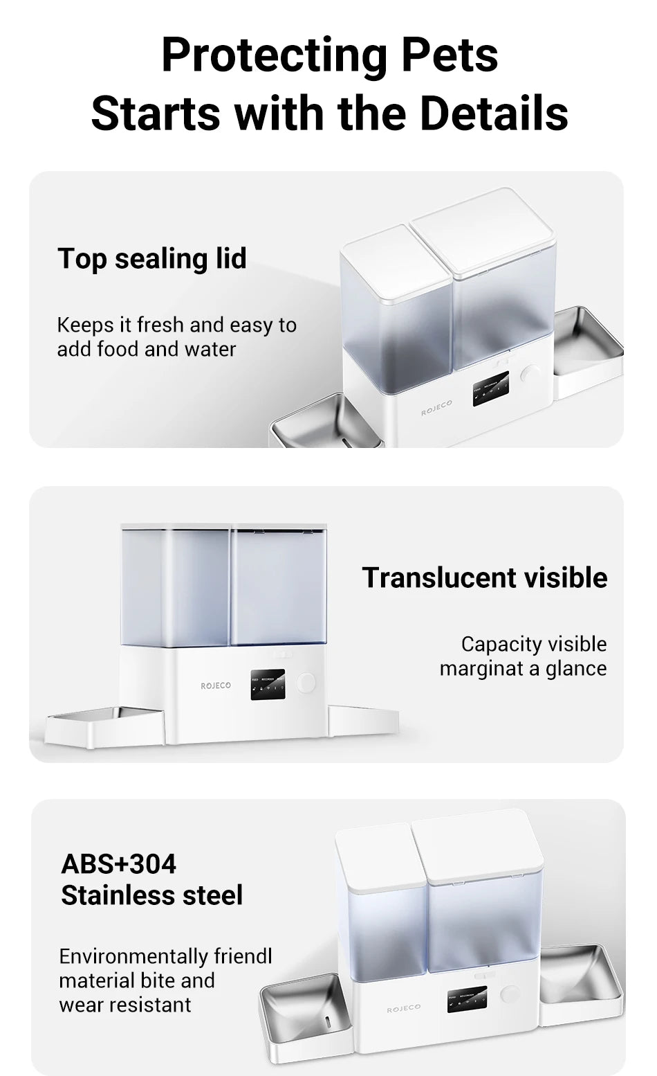 Product Feature 3: Feeding & Drinking 2-in-1. Whether you're at home or not, you can ensure that your furry friends always have fresh food and water.